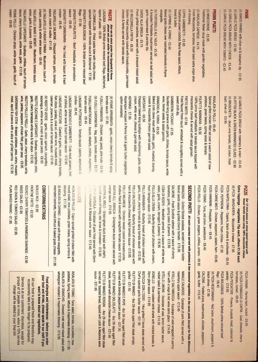 The pizza selection is equally enticing, with options ranging from the classic Pizza Margherita to the hearty Pizza Carne Misti. For a more substantial meal, explore the Secondi Piatti like Maiale Calvados and Salmone, showcasing fresh, high-quality ingredients.